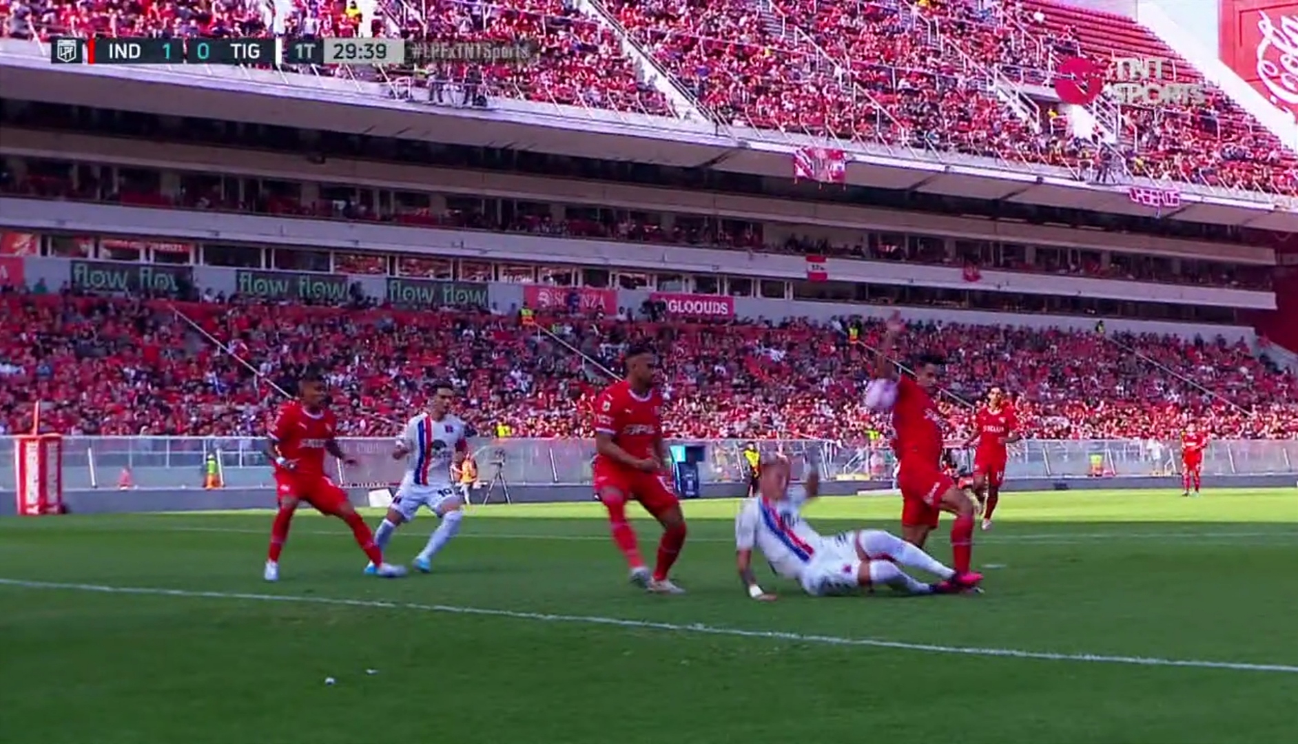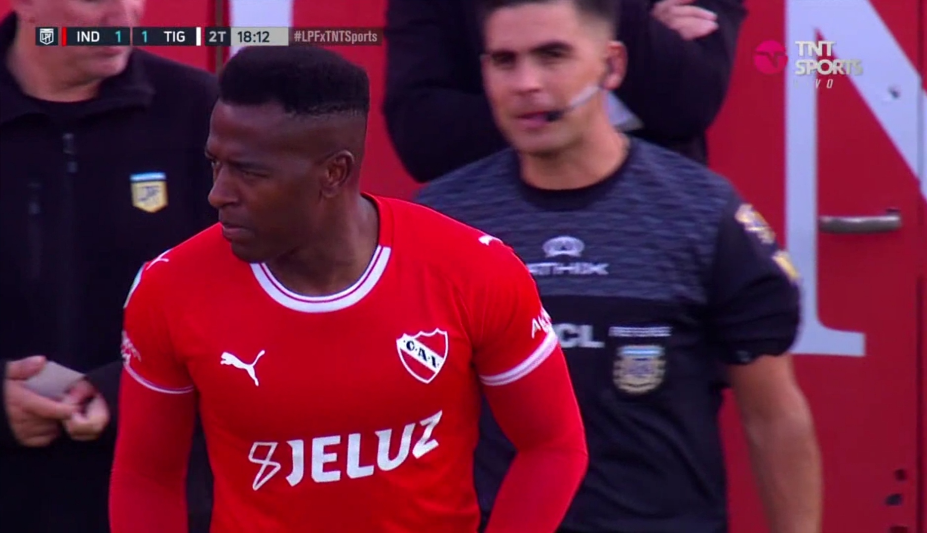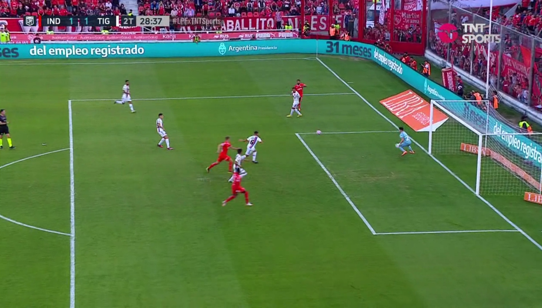El Matador siguió siendo dominado por el equipo de Zielinski, pero de a poco iba equilibrando la posesión. A pesar de que el local era más fuerte con y sin pelota, Tigre se las arregló para generar una ocasión que terminaría en polémica: Al 25' hay un centro al área de Independiente que pelean Sergio Barreto y Mateo Retegui. Nazareno Arasa, en principio, sancionó fuera de juego, pero tras revisar en el VAR, determinó que hay una mano de Barreto dentro del área, lo que da lugar al penal. Máxima pena a favor del cuadro visitante que pone el 1-1.
