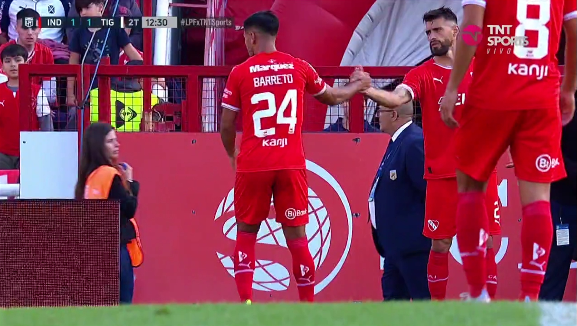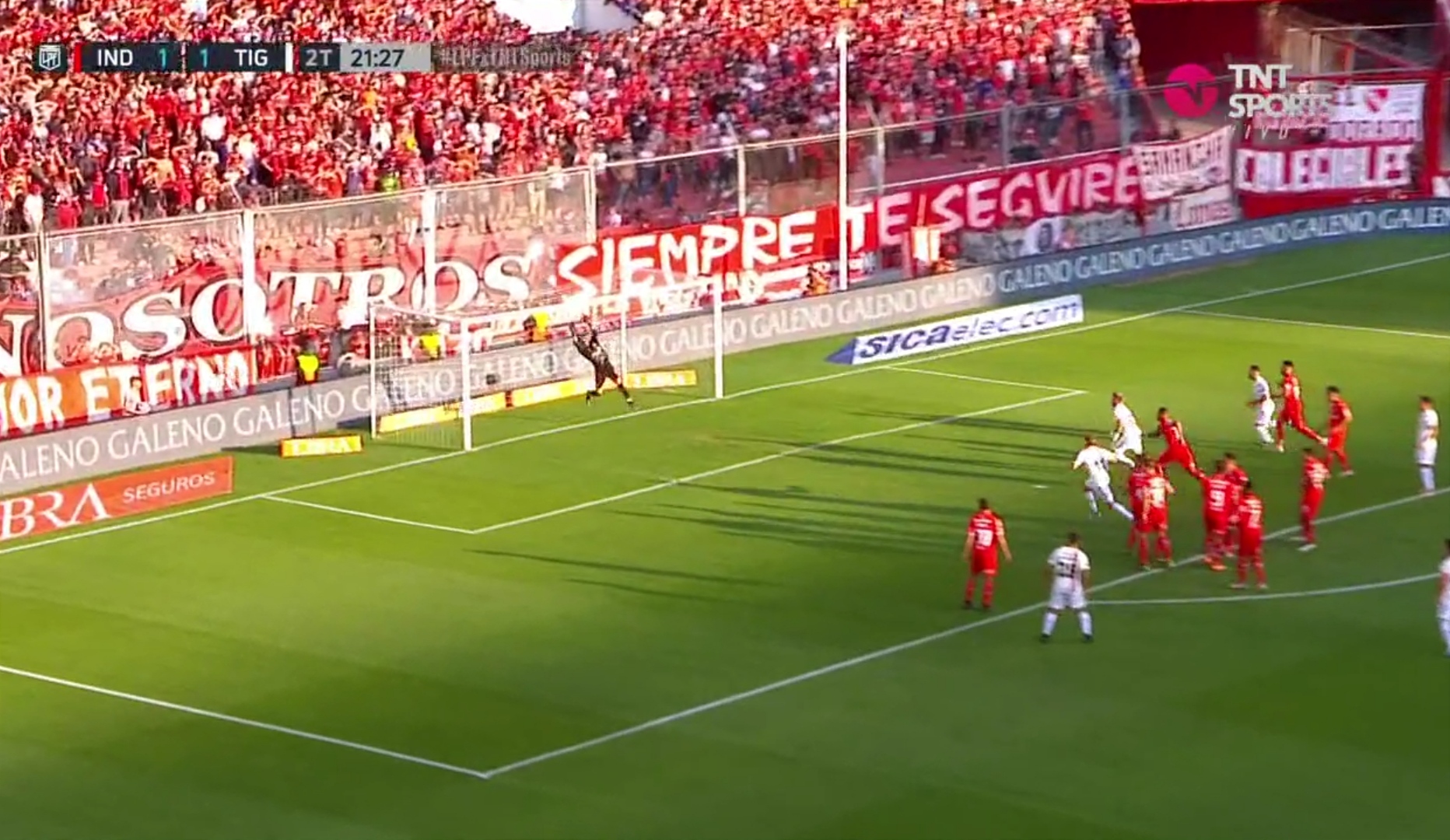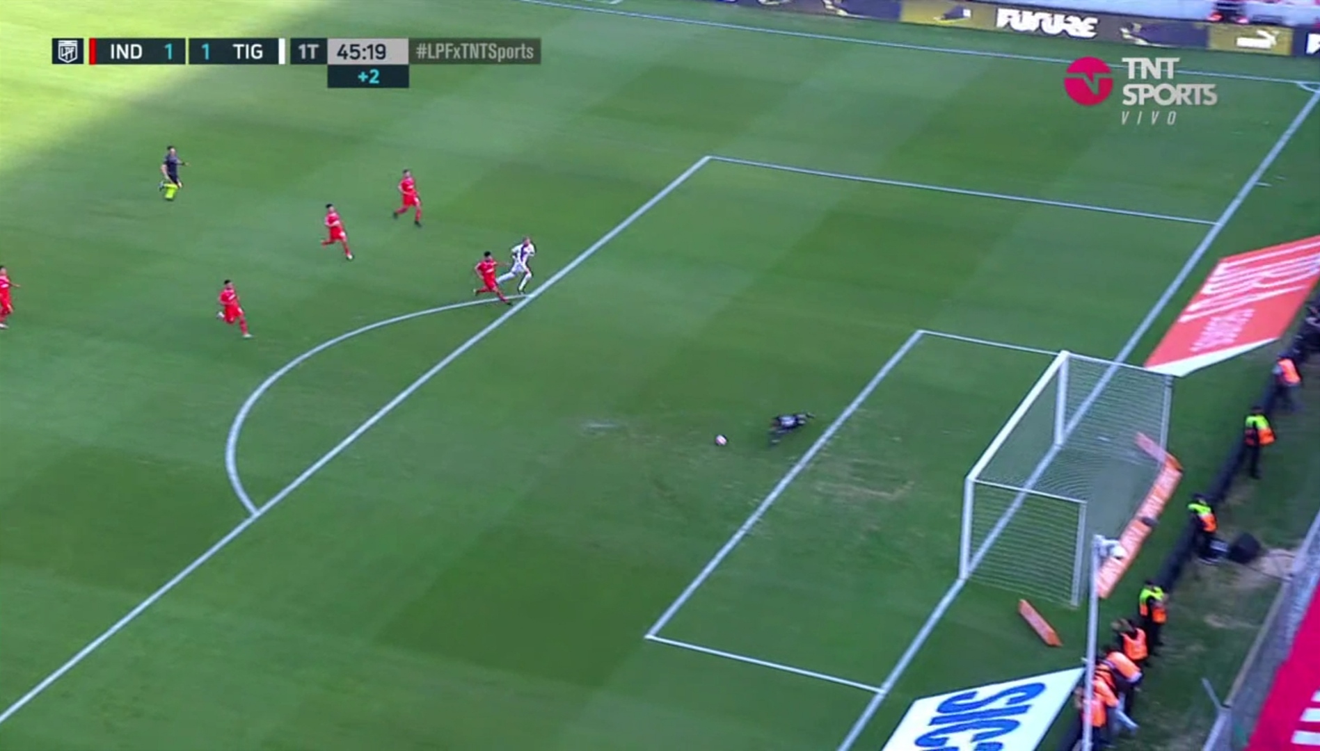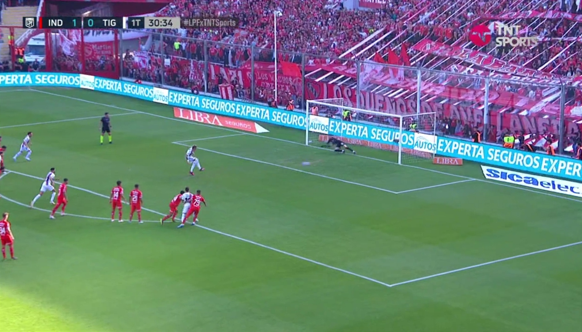 El Matador siguió siendo dominado por el equipo de Zielinski, pero de a poco iba equilibrando la posesión. A pesar de que el local era más fuerte con y sin pelota, Tigre se las arregló para generar una ocasión que terminaría en polémica: Al 25' hay un centro al área de Independiente que pelean Sergio Barreto y Mateo Retegui. Nazareno Arasa, en principio, sancionó fuera de juego, pero tras revisar en el VAR, determinó que hay una mano de Barreto dentro del área, lo que da lugar al penal. Máxima pena a favor del cuadro visitante que pone el 1-1.
